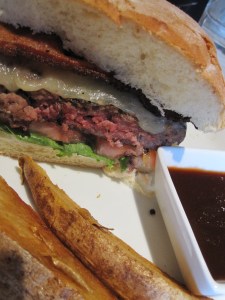 For dinner, Elise and I split a huge jalapeno-bacon cheeseburger.  It came with potato wedges that tasted fantastic dipped into the chipotle-espresso-barbeque sauce.
