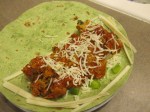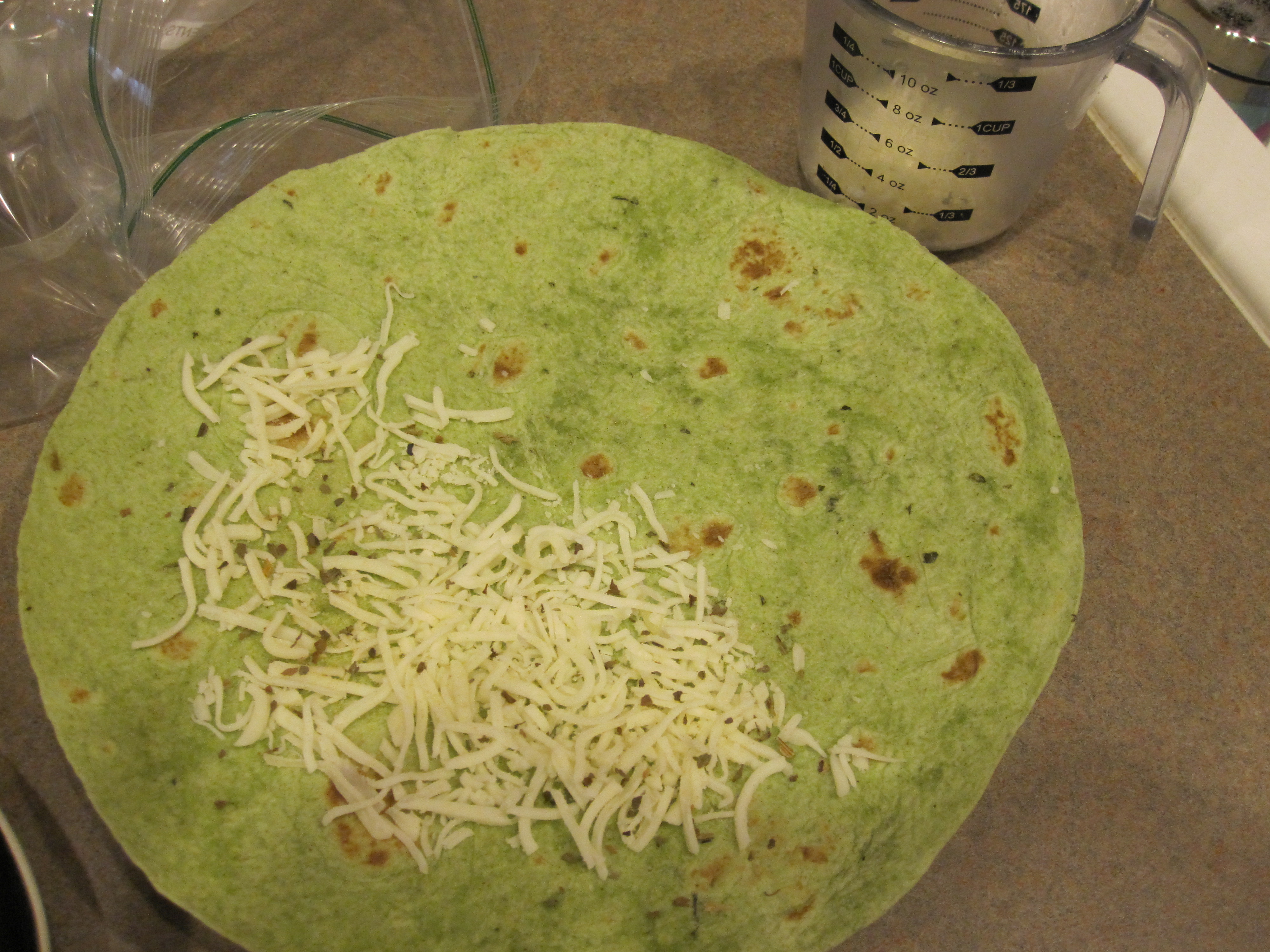 Heat oven to 375.  While pre-heating, place 1/2 of the shredded cheese and diced green peppers on one side of the wrap.