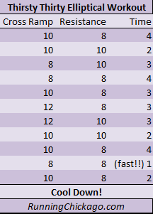 With all of this excitement going on over here, it’s been harder to have the longer workouts I love.  I won’t cut working out altogether though so I am making my shorter workouts count.  This is why my “thirsty thirty” elliptical workout was born! Next time you’re looking for a quick workout, try this one out: